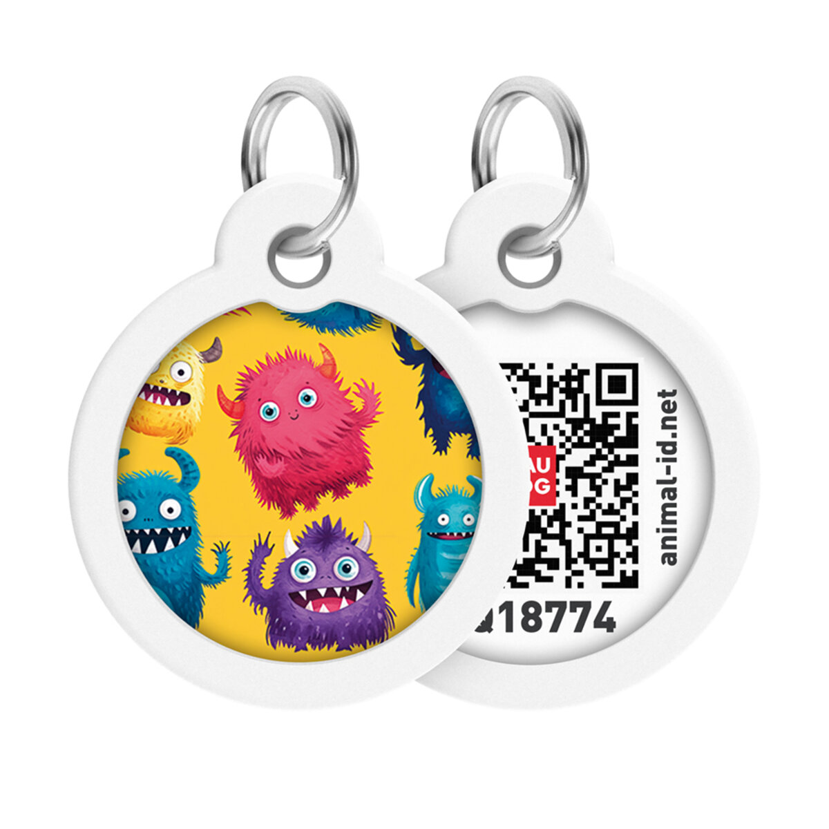 Адресник для собак і котів металевий WAUDOG Smart ID з QR паспортом, малюнок “Мохнаті монстри”, коло, Д 30 мм