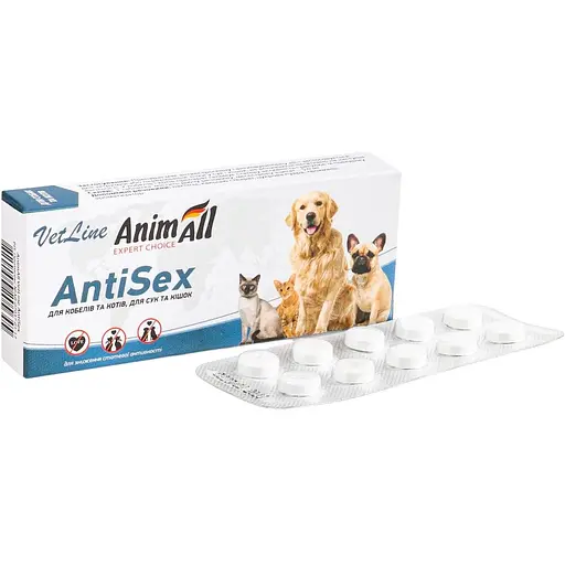 Таблетки AnimAll VetLine AntiSex для собак і котів мають антиестрогенову та антиовуляторну дії, застосовуються для затримки або переривання тічки у сук і котів, не впливаючи негативно на наступні вагітності. У псів і котів препарат гальмує статеву активність і регулює їх поведінку.