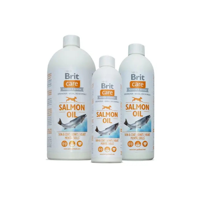 Brit Care Масло Лосося супер преміум якості. Brit Care Salmon Oil – це харчова добавка для собак усіх порід, корисна для усього організму тварин. Основна перевага масла лосося у тому, що воно є природнім джерелом поліненасичених жирних кислот Омега – 3 (EPA и DHA) та Омега – 6, які позитивно впливають на більшість метаболічних процесів в організмі. EPA – кислота володіє природнім протизапальною дією, DHA-кислота приймає участь у формуванні сітчатки очей, структур головного мозку та інших відділів нервової системи. Масло лосося унікальне тим, що жирні кислоти Омега – 3 та Омега – 6 у ньому знаходяться в оптимальному співвідношенні та приносять максимальну користь організму. При регулярному використанні масла лосося шкіра Вашого улюбленця буде здоровою, а шерсть міцною та блискучою.