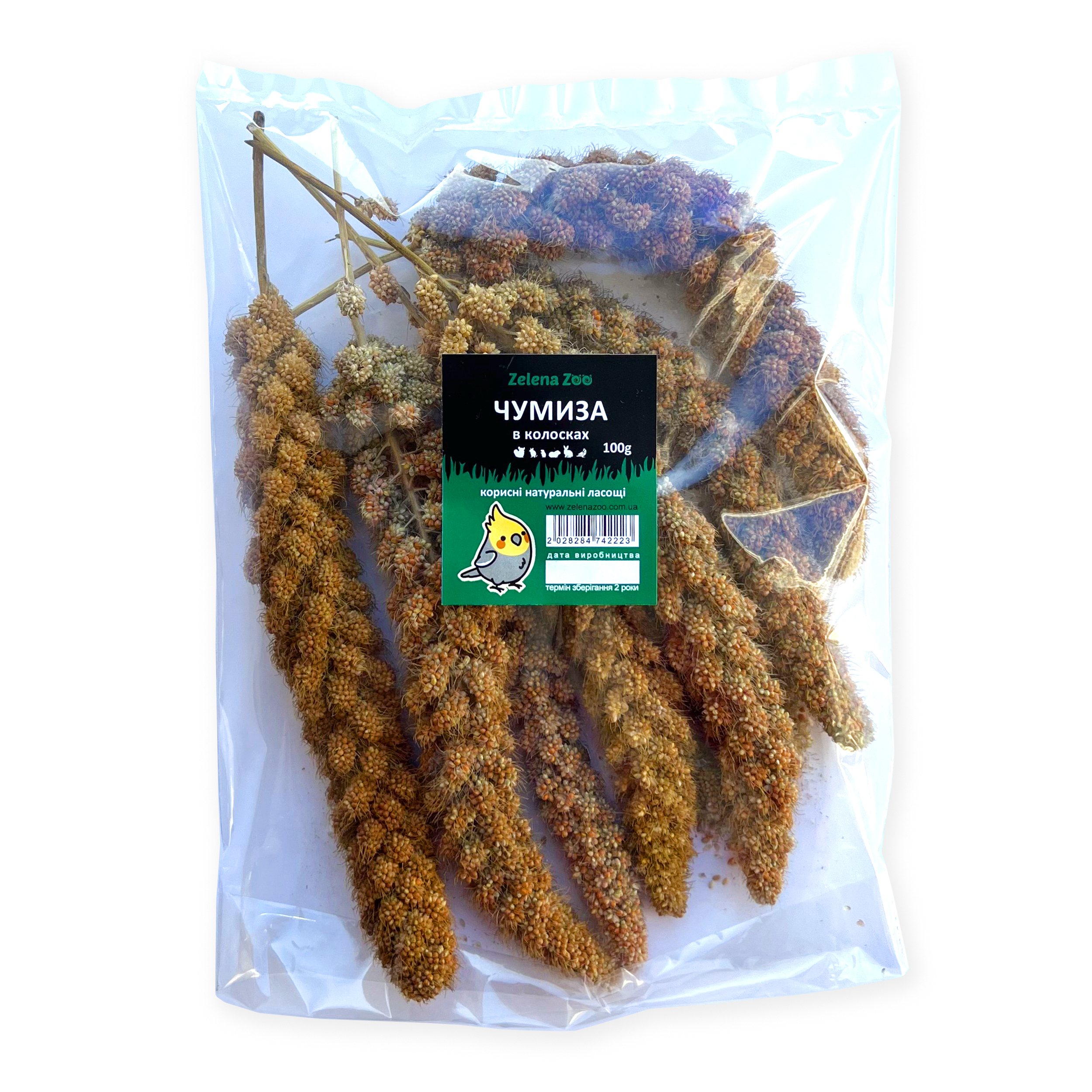 Чумиза в колосках 100 г для папуг та гризунів Zelena Zoo – це прекрасний корм для птахів та гризунів, особливо для хвилястих папуг і дрібних декоративних птахів. Чумиза це не основний корм, тому давати чумизу потрібно обмежено, а то ваш птах відмовиться їсти свій корм і буде їсти тільки чумизу!