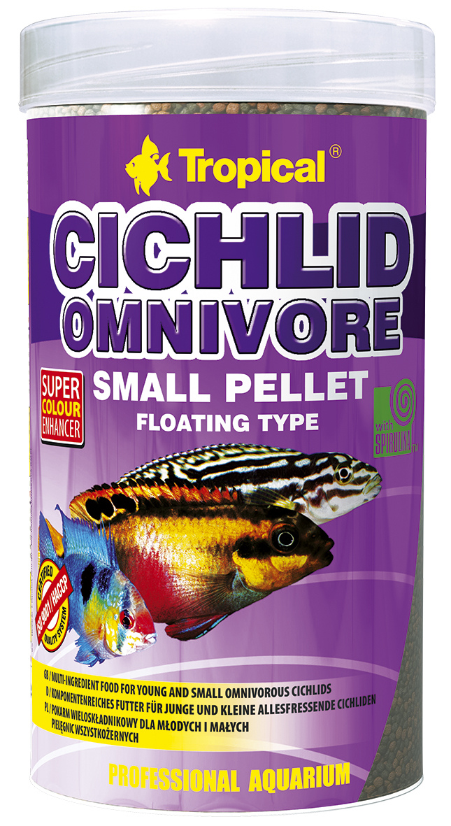 Tropical Cichlid Omnivore Small Pellet – корм в виде гранул, который используется для ежедневного кормления всеядных цихлид. Оптимальное содержание белка и астаксантина способствует хорошему росту, здоровому развитию и яркому окрасу рыб, а содержащиеся в корме компоненты растительного происхождения благоприятно влияют на развитие нереста.