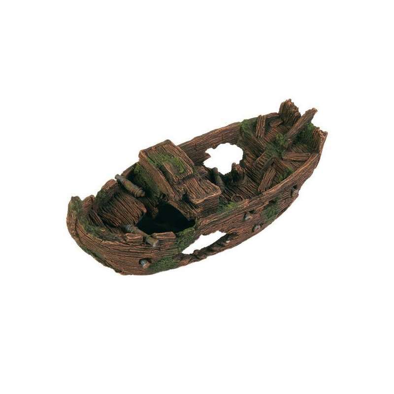 Декоративное изделие для аквариума в виде затонувшей лодки. Материал исполнения – полиэстер. Не оказывает воздействия на качество воды в аквариуме. Изделие устойчиво к воздействию соленой воды