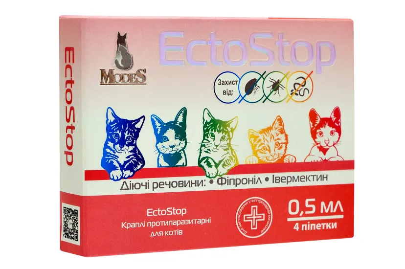 ЕктоСтоп (EctoStop) протипаразитарні краплі для котів до 4 кг, 0,5 мл, MODES (від бліх, від кліщів, від гельмінтів) 1 піпетка