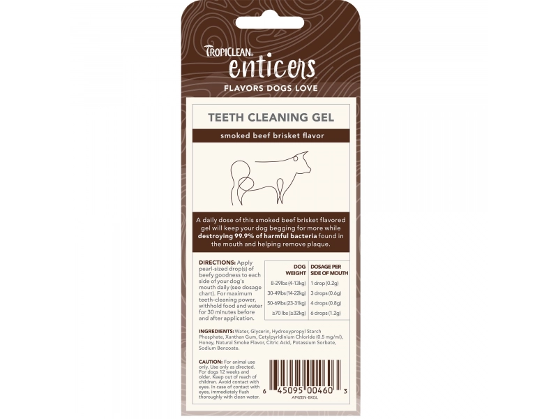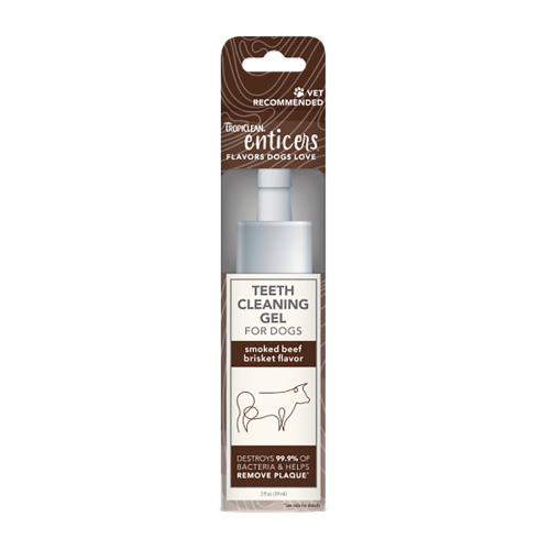 TropiClean Enticers Teeth Cleaning Gel – це чудовий засіб для догляду за порожниною рота зі смаком копченої яловичої грудки, який змусить вашу собаку просити почистити зубки. Гель складається з натуральних інгредієнтів, і доведено, що він допомагає усунути 99,9% першопричини зубного нальоту та неприємного запаху з рота.