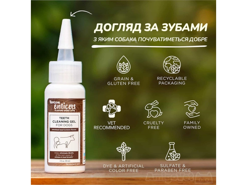 - Смак, який люблять собаки – смак копченої яловичої грудки викликає у собак у 3 рази більше апетиту, ніж конкуруючі гелі для догляду за порожниною рота. Компоненти TropiClean Enticers, що сприяють гарному самопочуттю, виготовлені з інгредієнтів природного походження, тож ви можете бути впевнені, що ваш вихованець отримує найякісніший догляд за порожниною рота.