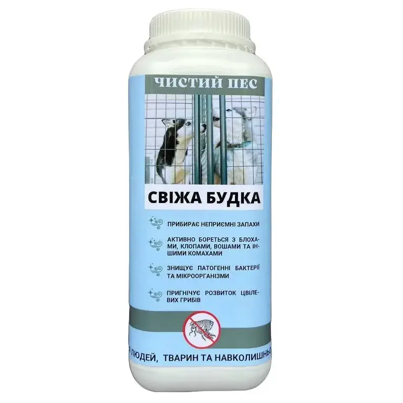 Гігієнічний засіб “СВІЖА БУДКА” від ТМ “ЧИСТИЙ ПЕС” для освіження, дезодорації та осушення простору утримання собак. У складі органічний інсектицид БАЙРАКЦИД для знищення бліх, клопів та інших ектопаразитів.