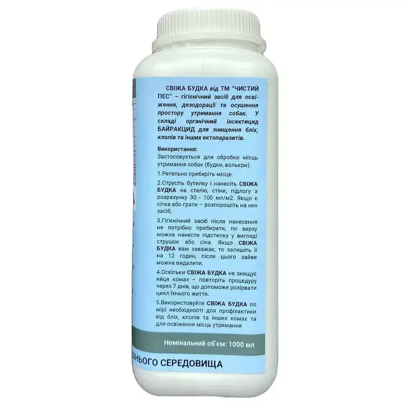 Гігієнічний засіб для освіження,дезодорації та осушення місць утримання собак “СВІЖА БУДКА” від тм “ЧИСТИЙ ПЕС”,1000мл
