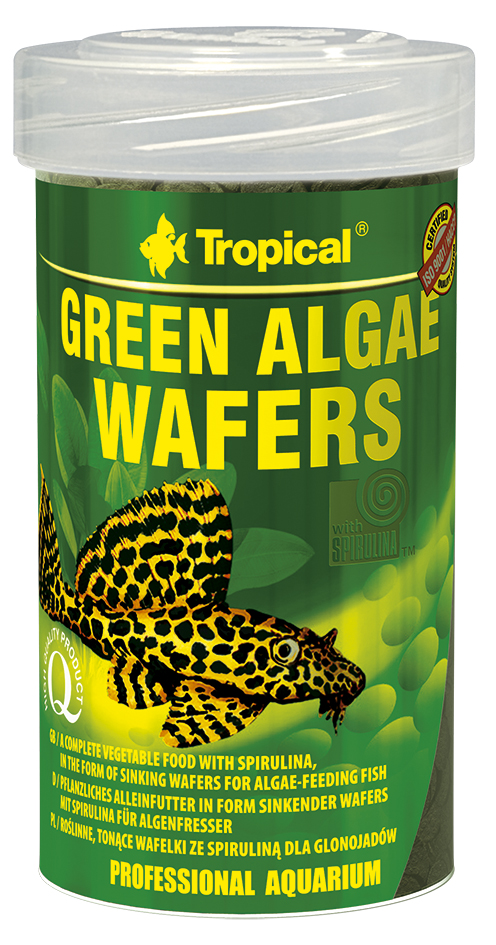 GREEN ALGAE WAFERS это корм в виде тонущих вафе¬лек со спирулиной, водорослями подводных лесов и листьями кетапанга, для ежедневного кормления растительноядных и всеядных кольчужных сомов семейства Loricariidae. Большая гидростабильность вафелек позволяет сохранить этой группе рыб приближенный к нату¬ральному способ жировки – в натуре много кольчужных сомов соскаб¬ли¬вает корм с твердой поверхности. Высокое содержание клетчатки и добавка спирулины и листьев кетапанга регулируют работу пищевари¬тельного тракта, предохраняя рыбы от опасных последствий запоров, а добавка цеолита благоприятно влияет на пищеварительную систему и удаление токсинов из организма рыб. Водоросли келп положи¬тельно влияют на иммунную систему рыб, а также являются источни¬ком макро- и микроэлементов, в том числе йода. КОРМЛЕНИЕ: несколько раз в день небольшими порциями. Кормле¬ние рыбок активных ночью производится при выключенном освещении аквариума.