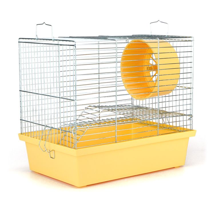 Декоративна клітка невеличких розмірів, виготовлена з безпечних для гризунів матеріалів. У комплектацію входить металева поличка та барабан для розваг її мешканців.