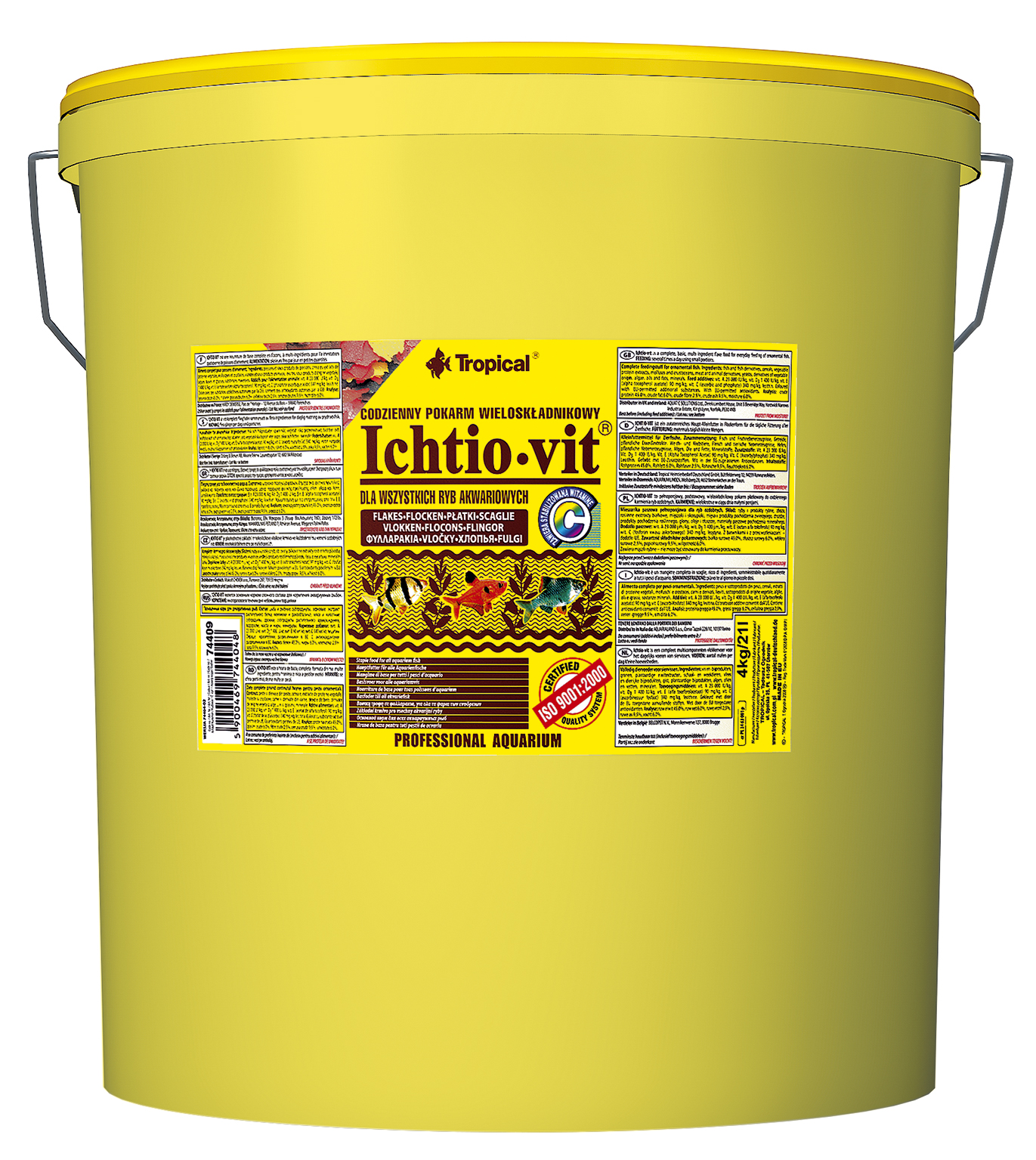 ICHTIO-VIT це багатокомпонентний корм у вигляді пластівців, призначений для щоденного годування всеїдних акваріумних риб. Незамінний у загальних акваріумах із багатовидовим заселенням. Завдяки оптимально балансованому складу і добавці необхідних вітамінів і мікроелементів забезпечує правильний ріст і розвиток риб. Стійкість риб до захворювань підвищує стабілізований вітамін С, а добавка цеоліту сприятливо впливає на систему травлення і видалення токсинів з організму риб. ГОДУВАННЯ: багаторазово протягом дня малими порціями.