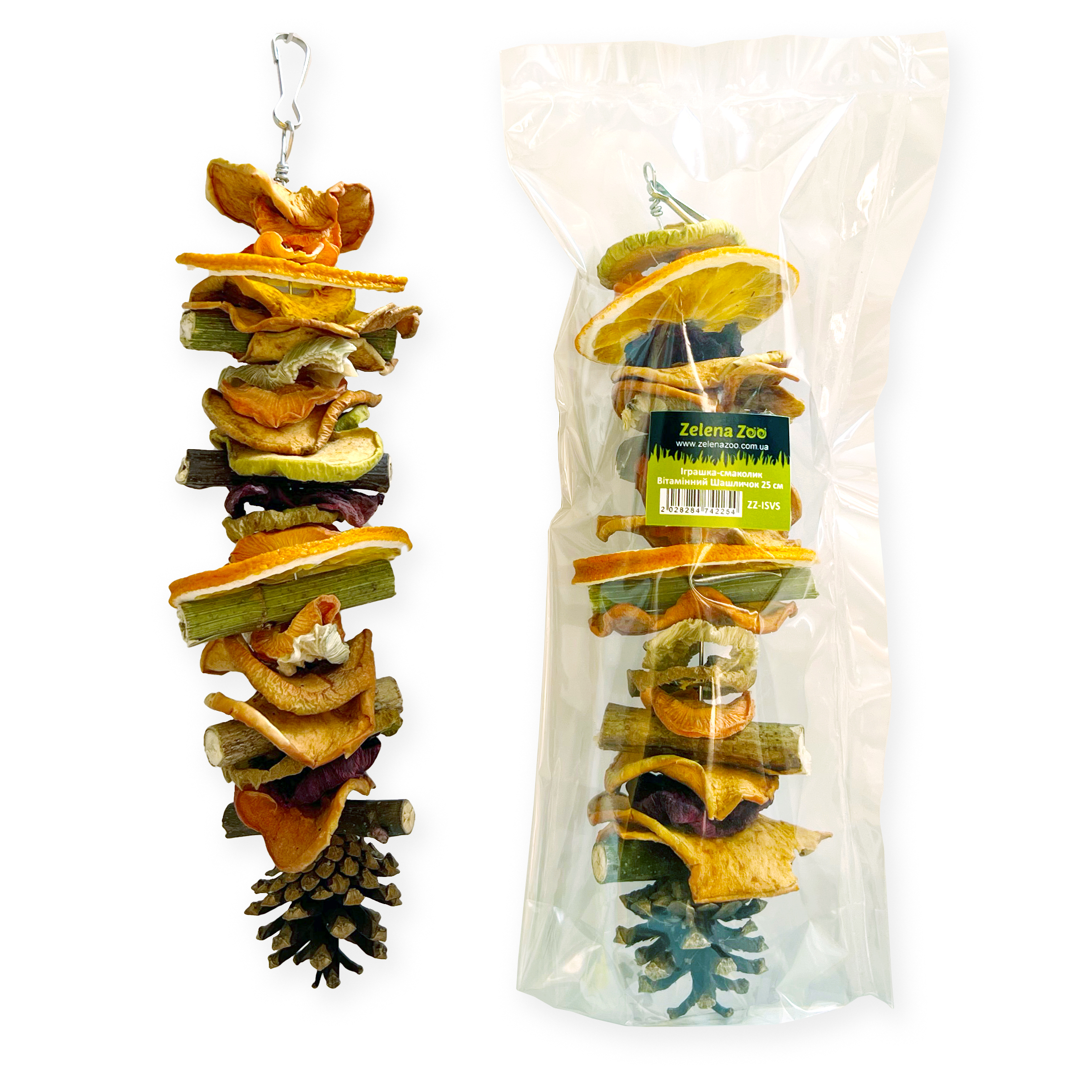 Виготовлений з натуральних фруктів, овочів та гілочок і шишки, багатих на вітаміни та мікроелементи, цей шашличок підтримує активність, здоров’я та гарний настрій вашого улюбленця. Ідеальне рішення для задоволення природних інстинктів та покращення добробуту вашого улюбленця!