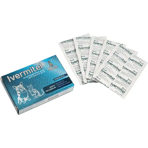 Таблетки Modes Ivermitel для собак і котів – антигельмінтний засіб з широким спектром дії проти цестод, трематод і нематод. Містить три активні компоненти: празиквантел, пірантелу памоат і івермектин.