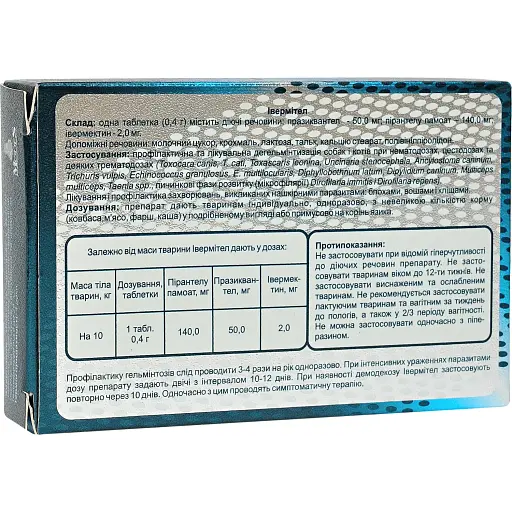Пірантелу памоат 140 мг; івермектин 2 мг; празиквантел 50 мг.