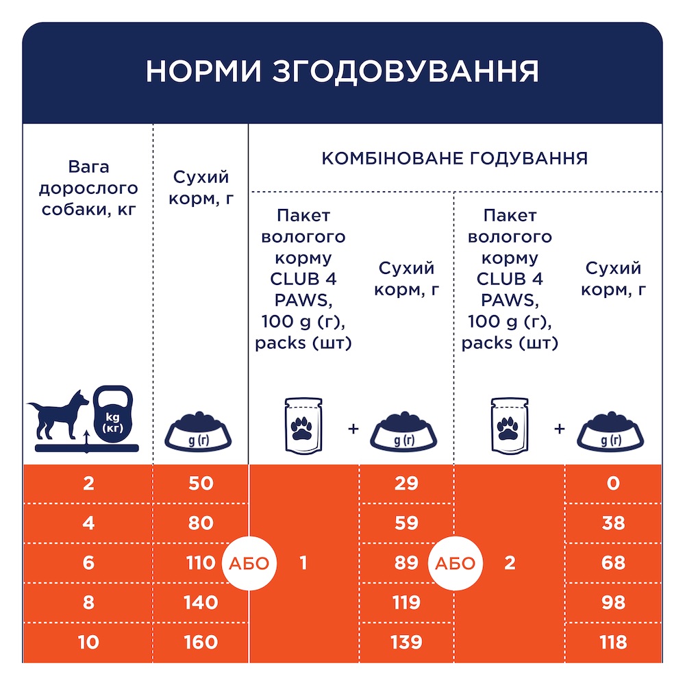 Зберігати в темному місці у закритому спожитковому пакованні за температури від +5 ºС до +25 ºС та відносної вологості не більше, ніж 75 %. Корм необхідно вводити в раціон поступово (принаймні протягом перших 5-ти d (днів)). Забезпечте тварині постійний доступ до чистої свіжої питної води. Індивідуальні норми годування можуть змінюватися, залежно від віку, породи, рівня активності та середовища перебування тварини. Комбінуйте годування з вологим кормом CLUB 4 PAWS Преміум “З куркою в желе”. Повнораціонний консервований корм для дорослих собак.