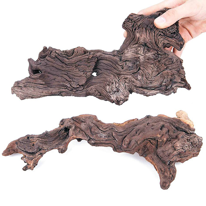 Древесина очень крепкая, трудно пробивается даже гвоздем, поэтому любую растительность лучше крепить резинками. Воду окрашивает в чайный цвет, рыбкам это не вредит, через полгода, при регулярных подменах воды, окрашивание воды проходит.