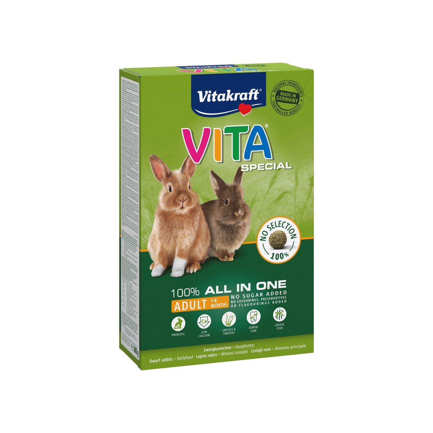 Повнораційний корм для кроликів. Ідеально підходить для вибагливих тварин. Смачний корм для кроликів VITA Special багатий на протеїни люцерни, зародки пшениці та смачні овочі. Корм розроблений провідними ветеринарними фахівцями та містить життєво необхідні поживні речовини в оптимальній кількості для задоволення всіх потреб дорослих кроликів. Незамінні жирні кислоти підтримують здоров’я шкіри та вовни. Велика кількість клітковини сприяє оптимальному травленню та тривалішому жуванні, таким чином сточуючи зуби гризуна. До складу Vitakraft VITA Special входить натуральний пребіотик інулін, який позитивно впливає на мікрофлору кишечника. Омега-3 та омега-6 жирні кислоти сприяють здоров’ю шкіри та вовни. Вітаміни: з життєво важливими вітамінами, мінералами та мікроелементами для оптимального догляду. Анти-запах: спеціальна комбінація з 3-х натуральних інгредієнтів пов’язує неприємні запахи та зменшує їхнє утворення.