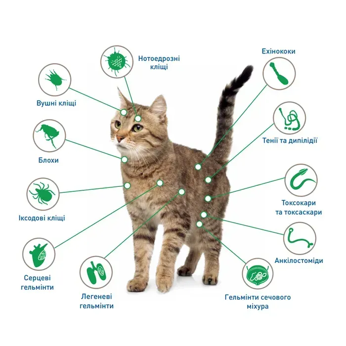 - має виражену протидію щодо ектопаразитів (воші, блохи, волосоїди, кліщі) та ендопаразитів (гастроентеральні нематоди, легеневі нематоди, дирофілярії та гельмінти сечового міхура)