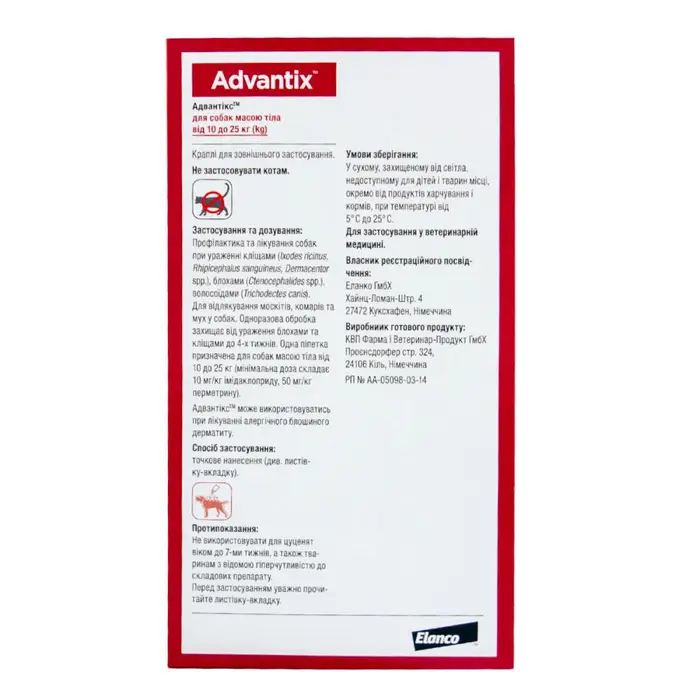 Краплі на холку для собак Elanco Bayer Advantix від 10 до 25 кг (ціна за 1 піпетку)