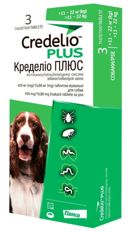 - Кределіо ПЛЮС 450 мг/16,88 мг таблетки жувальні для собак масою тіла (>11 – 22 кг)