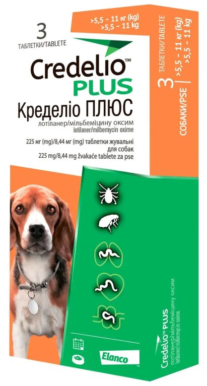 - Кределіо ПЛЮС 225 мг/8,44 мг таблетки жувальні для собак масою тіла (>5,5 – 11 кг)