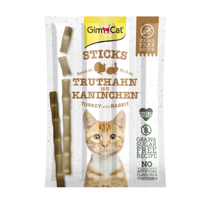 GimCat Sticks – це смачні закуски з високим вмістом м’яса для котів. Вони справжні ласощі для вашого вихованця! Ці снеки дуже смачні та не містять доданий цукор, зерно, а також штучних барвників та ароматизаторів.