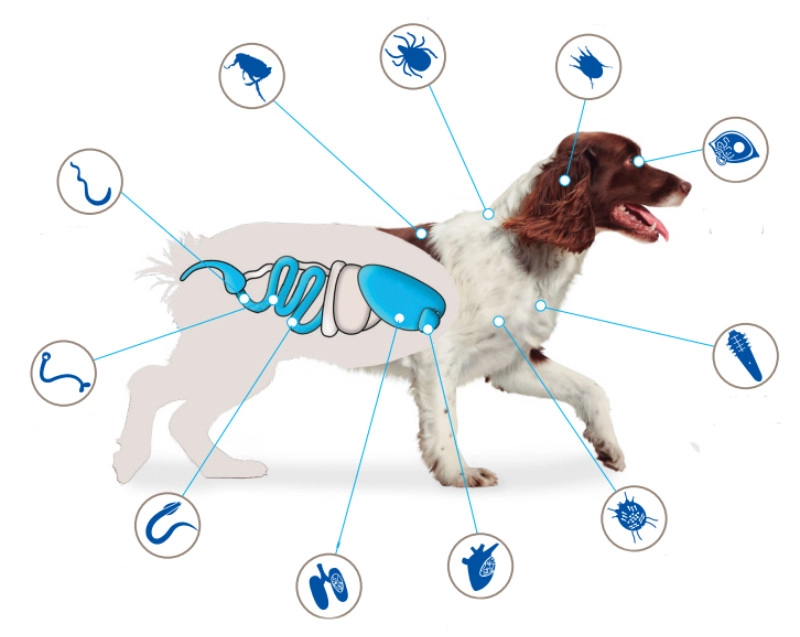 - Профілактика та лікування собак при ураженнях кліщами (Dermacentor variabilis, D. reticulatus, Ixodes ricinus, I. scapularis, I. hexagonus, Rhipicephalus sanguineus, Amblyomma americanum та Haemaphysalis longicornis) та блохами (Ctenocephalides fe.