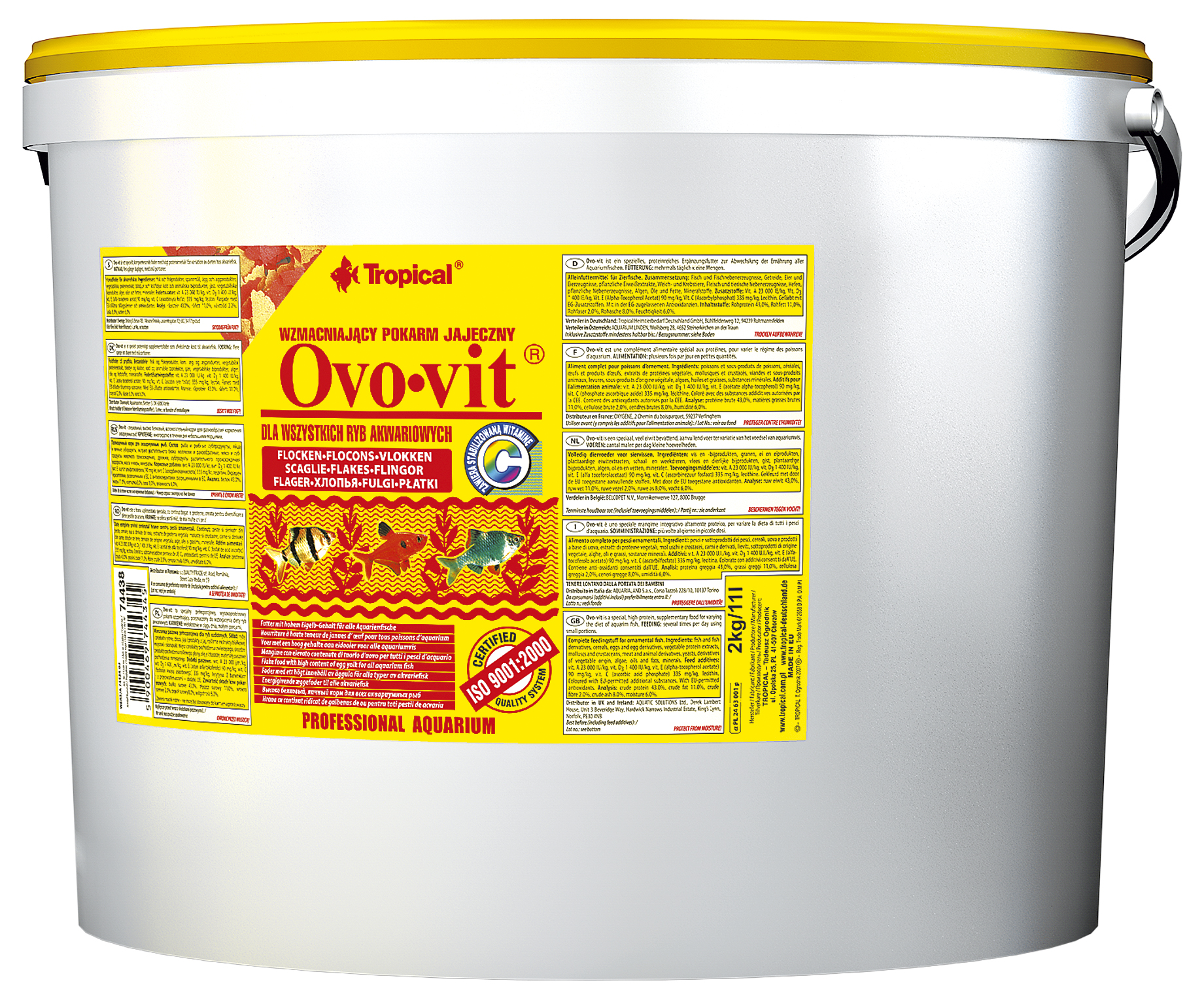 OVO-VIT это укрепляющий корм в виде хлопьев, с добавкой яиц. Поставляет рыбам ценный белок, ненасыщенные жирные кислоты и хорошо усваиваемый лецитин из яичных желтков. Благодаря своему составу хлопья OVO-VIT способствуют росту, созреванию и приступ-лению рыб к нересту, поэтому рекомендуются прежде всего для нерестящихся, а также для молодых, растущих рыб, потребность которых в питательных компонентах является особенно высокой. Стабилизированный витамин С укрепляет иммунную систему, а на-ту¬ральные каротиноиды происходящие, в частности, из перца и кре-веток, усиливают окраску рыб. Добавка цеолита благоприятно вли¬яет на пищеваритель¬ную систему и удаление токсинов из организма рыб. КОРМЛЕНИЕ: многократно в течениe дня малыми порциями.
