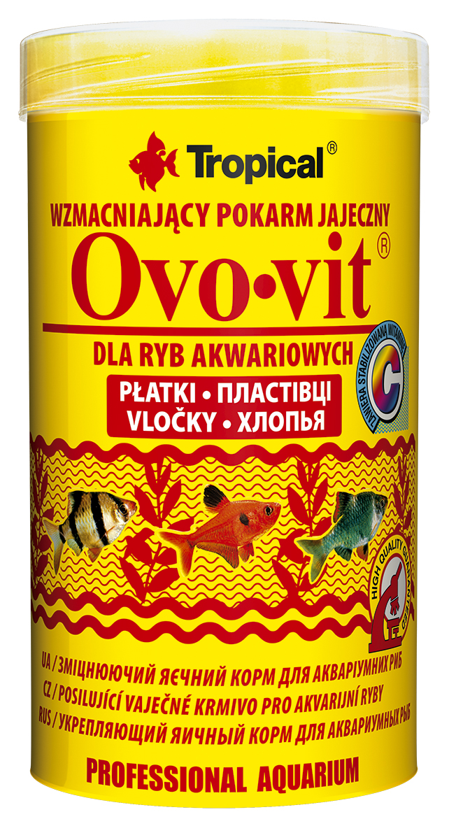 OVO-VIT это укрепляющий корм в виде хлопьев, с добавкой яиц. Поставляет рыбам ценный белок, ненасыщенные жирные кислоты и хорошо усваиваемый лецитин из яичных желтков. Благодаря своему составу хлопья OVO-VIT способствуют росту, созреванию и приступ-лению рыб к нересту, поэтому рекомендуются прежде всего для нерестящихся, а также для молодых, растущих рыб, потребность которых в питательных компонентах является особенно высокой. Стабилизированный витамин С укрепляет иммунную систему, а на-ту¬ральные каротиноиды происходящие, в частности, из перца и кре-веток, усиливают окраску рыб. Добавка цеолита благоприятно вли¬яет на пищеваритель¬ную систему и удаление токсинов из организма рыб. КОРМЛЕНИЕ: многократно в течениe дня малыми порциями.