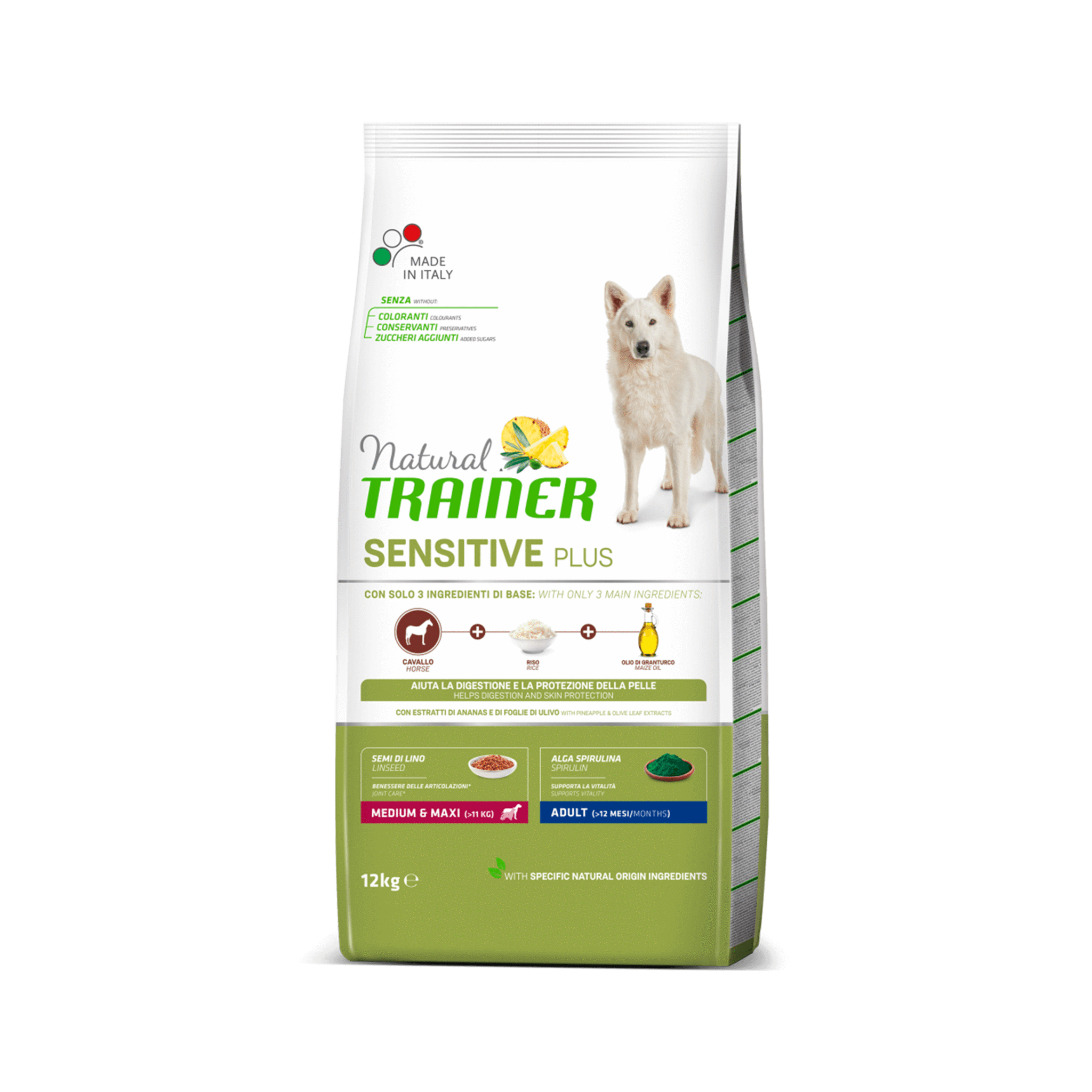 NATURAL TRAINER DOG SENSITIVE ® (НАТУРАЛ трейнер ДОГ сенситив ® ) Едалт Медиум энд Макси с кониной, рисом и маслом.