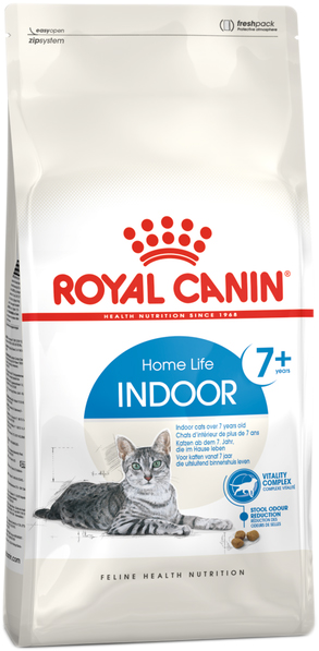 Сухий корм Royal Canin Indoor +7 – сухий корм для кішок, що старіють (у віці від 7 до 12 років), що живуть у приміщенні. По досягненні віку 7 років у кішки на клітинному рівні активізуються процеси старіння, хоча видимі ознаки старіння можуть з’явитися набагато пізніше. Особливо часто вікові проблеми зачіпають функцію нирок, суглоби та імунну систему. Зуби та ясна також стають більш чутливими, так що кішці важче розгризати корм. Адаптоване харчування для кішок, що старіють, продовжить термін життя кішки і підвищить її якість.