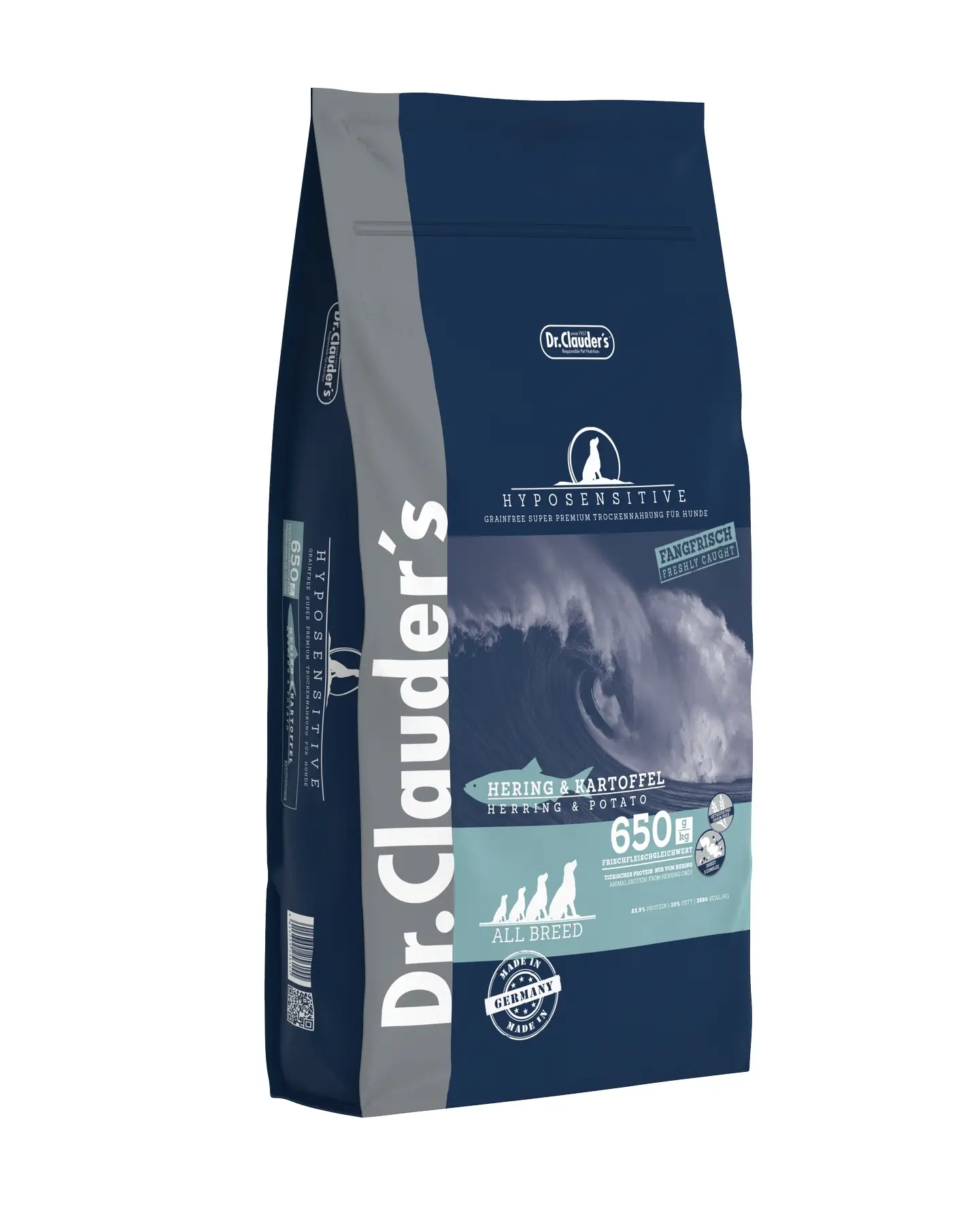 Інгредієнти: солодка картопля 32%, оселедець морожений 20%, рибне борошно з оселедця 15%, горох зневоднений, буряковий жом (зі зниженим вмістом цукру), картопляне борошно 6%, лососева олія 3.5%, гідролізат протеїну вегетаріанського походження, лляне насіння, пивні дріжджі 1%, Dr.Clauder’s Pro Digest 5 Complex (дріжджі, порошок папайї, порошок ананаса, порошок журавлини, дріжджовий бета-глюкан, інулін (FOS), порошок спіруліни, мука коноплі) 0.8%, порошок цикорію (як джерело інуліну) 0.4%.