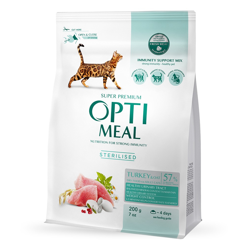Стерилізовані коти мають інші потреби в харчуванні, ніж їхні нестерилізовані побратими. Після процедури стерилізації їхній метаболізм зазнає змін, які вимагають ретельного контролю раціону. Корм Optimeal з індичкою та вівсом спеціально розроблений для задоволення цих потреб.