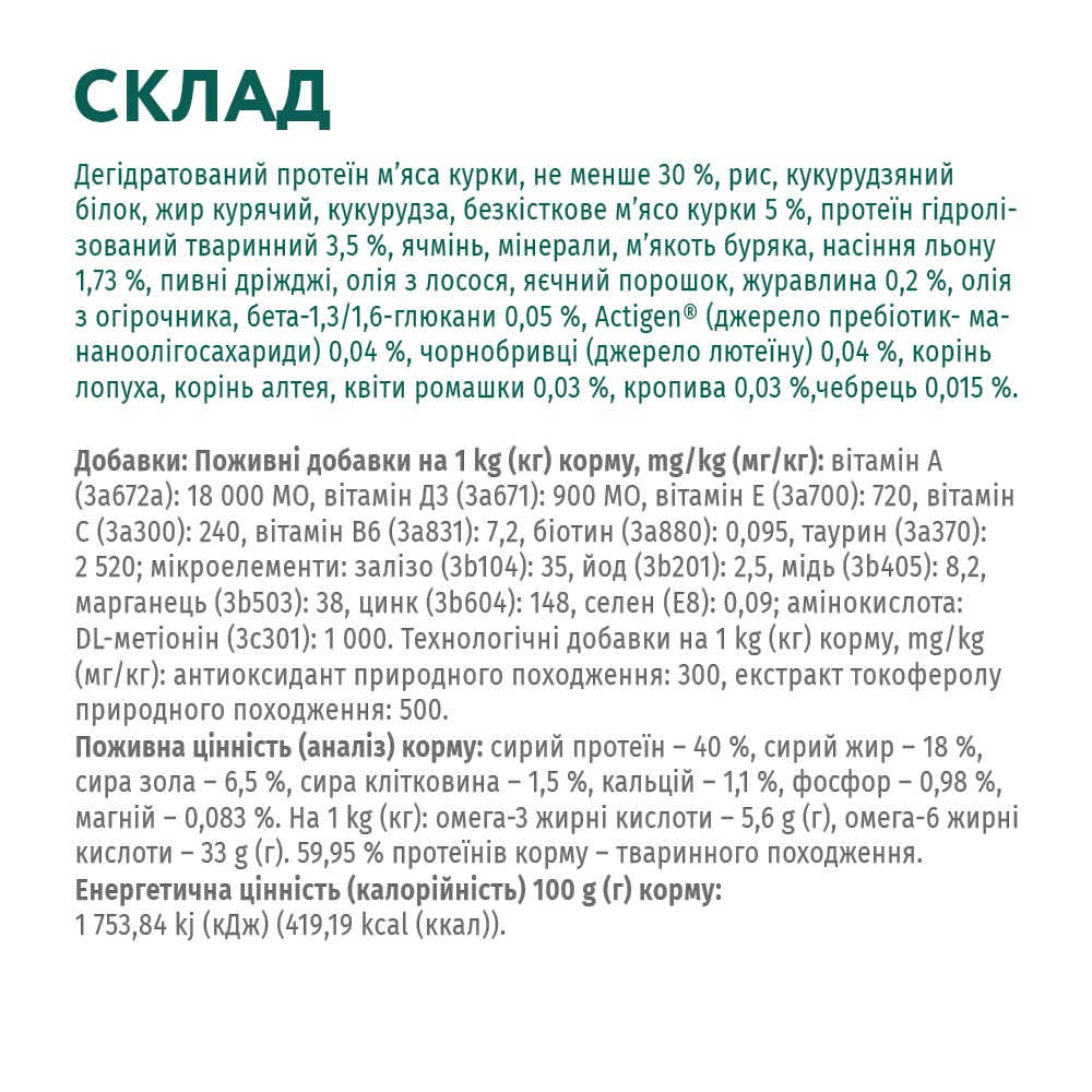 - Корм містить мікс для підтримки імунітету, цілющі трави, справжні ягоди та всі необхідні мікроелементи.