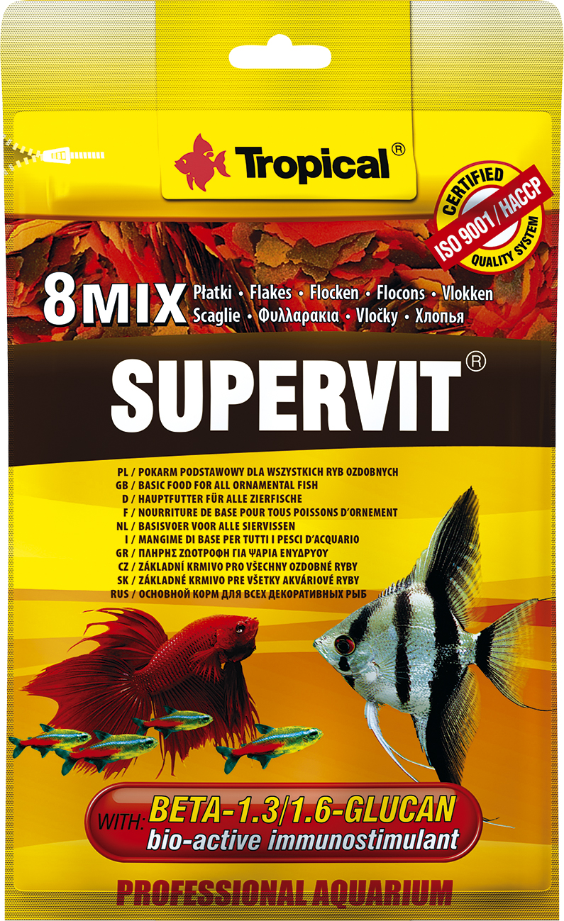 SUPERVIT является полноценным многокомпонентным хлопьевидным кормом самого высокого качества, предназначенным для ежедневного кормления всех аквариумных рыб. Компоненты корма учитывают различные пищевые потребности разных видов рыб, выращиваемых одновременно. Содержащиеся в корме: натуральный иммуностимулятор Бета-1,3/1,6-Глюкан и стабилизированный витамин С эффективно укрепляют иммунологическую систему рыб, защищая их от инфекций. Клетчатка и хитин регулируют процесс пищеварения и выделения, каротиноиды интенсифицируют окраску, а лецитин повышает витальность и способствует размножению. Добавка цеолита благоприятно вли¬яет на пищеваритель¬ную сис¬тему и удаление токсинов из организма рыб. КОРМЛЕНИЕ: многоразовое в течение дня, небольшими порциями.