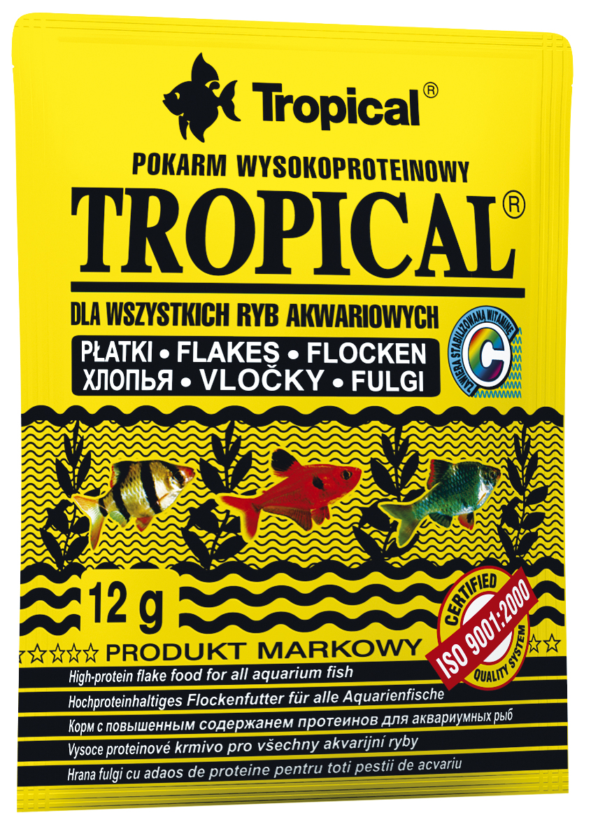 TROPICAL это высокобелковый корм в виде хлопьев для ежеднев-ного кормления всеядных и плотоядных аквариумных рыб. Рекомен-дуется также для нерестящихся рыб, подрастающих мальков и молодых рыб, являясь источником ценного белка животного и рас-тительного происхождения, богатого необыкновенно важными экзо-генными аминокислотами. Регулярно применяемый, обеспечивает эффективный рост массы тела и поставляет необходимые вита-мины, а также микро- и макроэлементы. Стабилизированный витамин С укрепляет иммунную систему рыб, а добавка цеолита благоприятно влияет на пищеваритель¬ную систему и удаление токсинов из организма рыб. КОРМЛЕНИЕ: многократно в течениe дня малыми порциями.