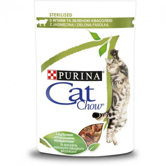 Волога грудка Cat Chow Sterilised (Кет Чау стерелайзед) Ніжні шматочки з ягнятком і зеленою квасолею для стерилізованих кішок, 85 г